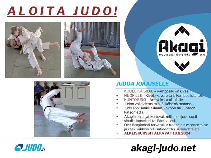 Akagi on vuonna 1997 perustettu aktiivinen judoseura, jonka sali löytyy Liikuntakeskus Piiroselta Järvenpäässä (os. Lukionkatu 3). Toiminnastamme, tapahtumista ja yhteyshenkilöistä saat tietoa näiltä sivuilta.