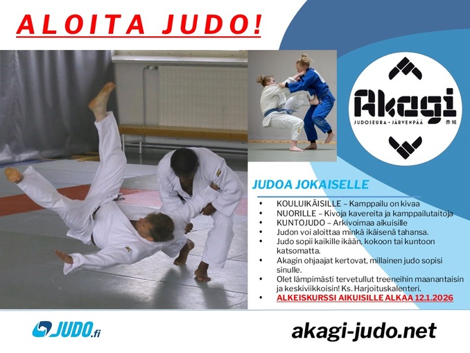 Aikuisten ja yli 13-vuotiaitten alkeiskurssi alkaa 12.1.2026 eilen ALOITA JUDO! |